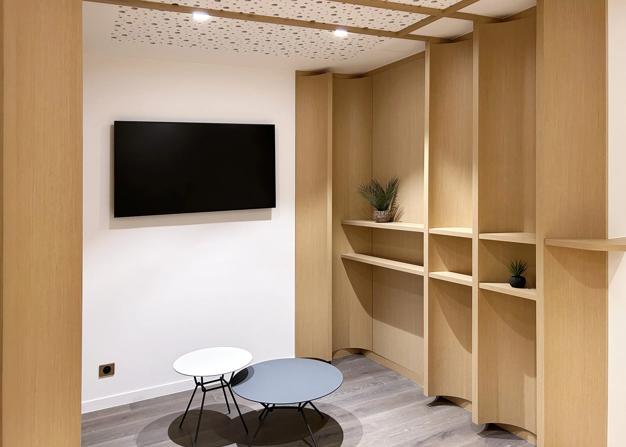 Chaque espace raconte son propre chapitre : au rez-de-chaussée, les volumes ouverts semblent s’être créés d’eux-mêmes, tandis qu’au sous-sol, l’amphithéâtre revisité offre une déambulation rythmée par les modules courbes et les panneaux boisés.
