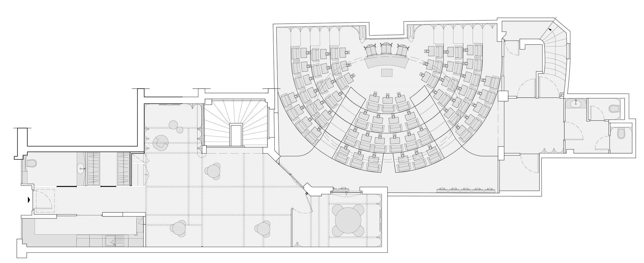 Organisation en enfilade, favorisant la visibilité et la circulation : espaces de réception, zones polyvalentes et amphithéâtre se répondent visuellement.