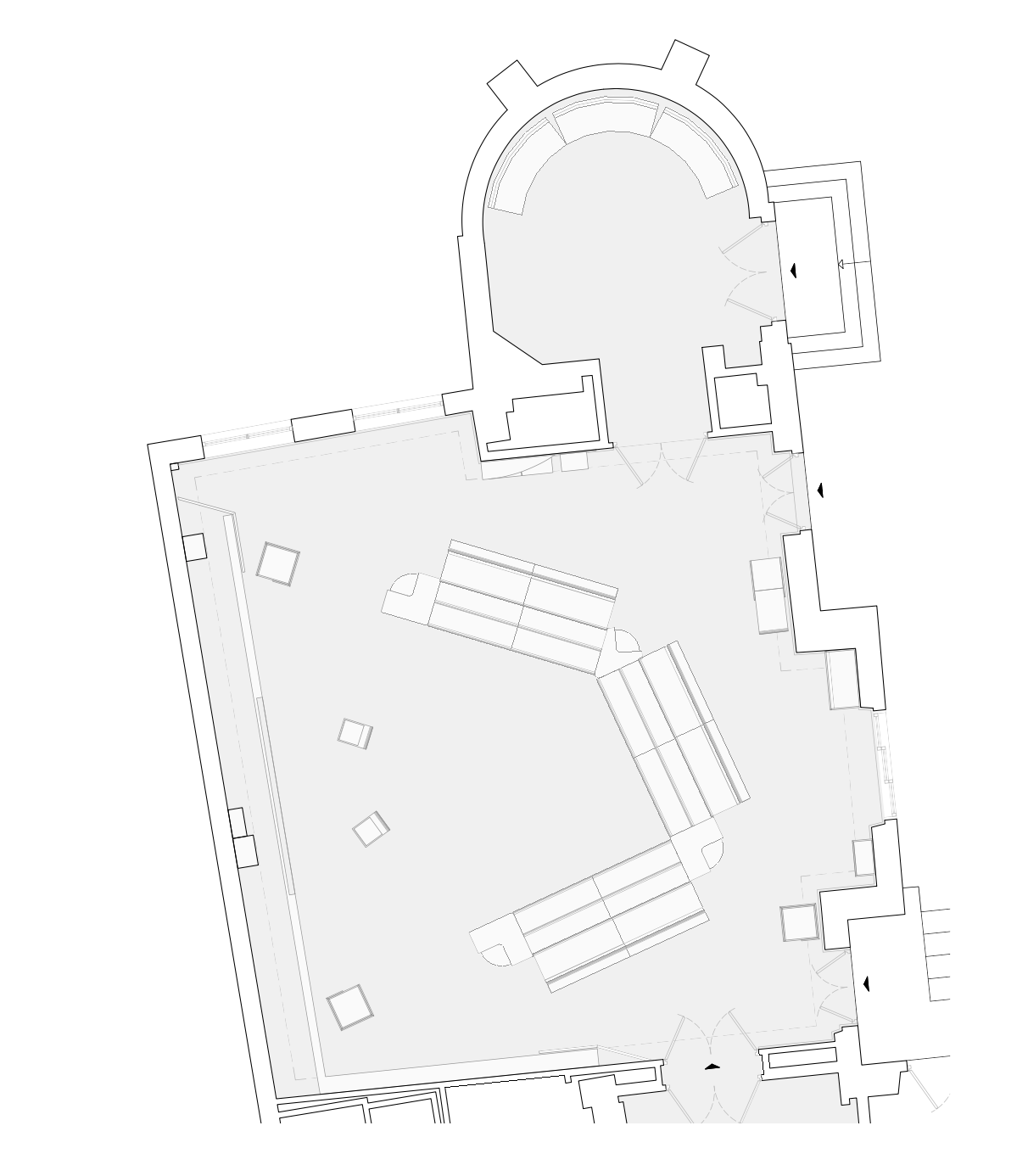 Les banquettes sur roulettes, conçues pour accueillir 36 personnes réparties sur deux niveaux, épousent la forme ergonomique du corps humain, offrant une expérience d'assise unique, guidée par les escaliers à 45° et 90° qui structurent l'espace.