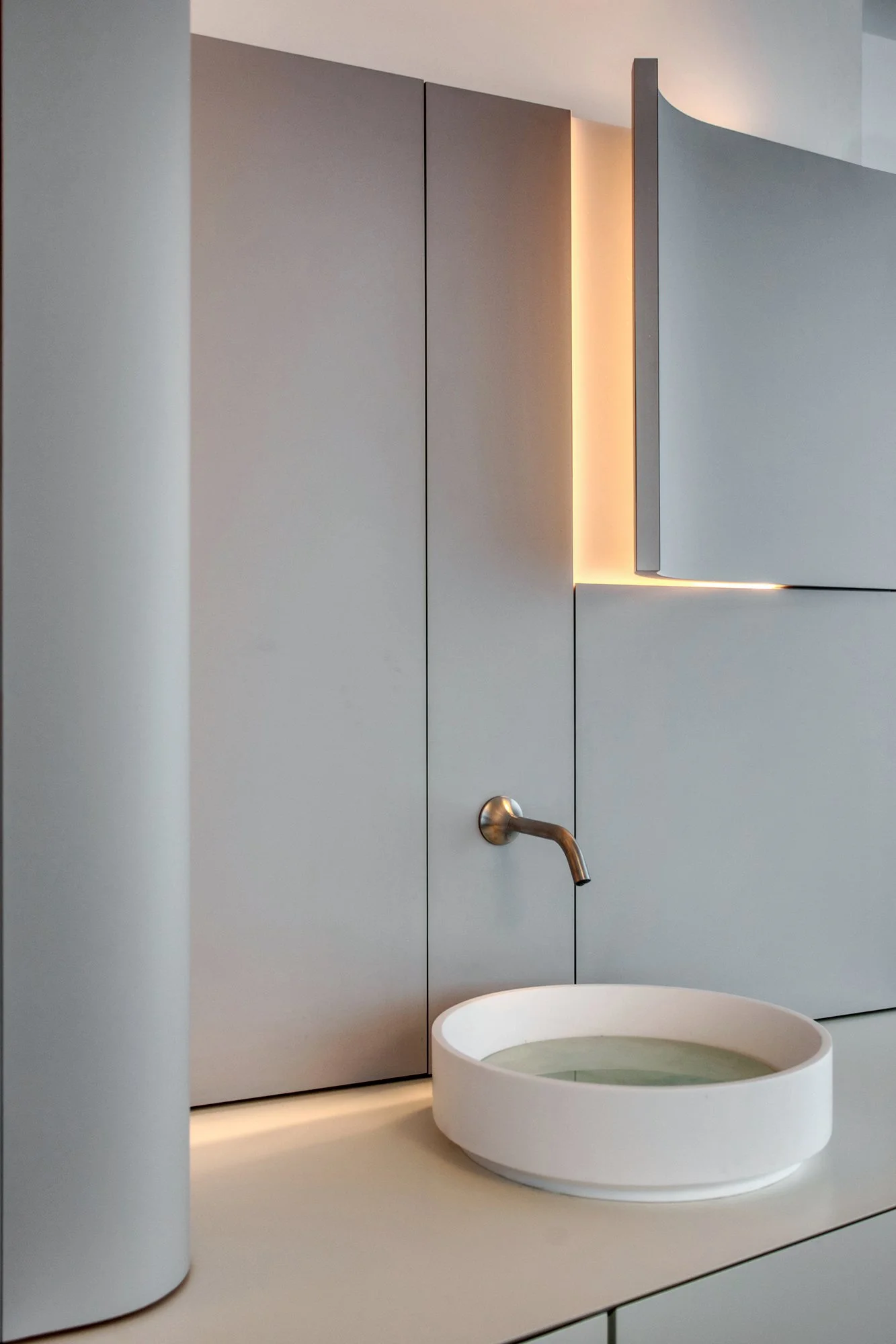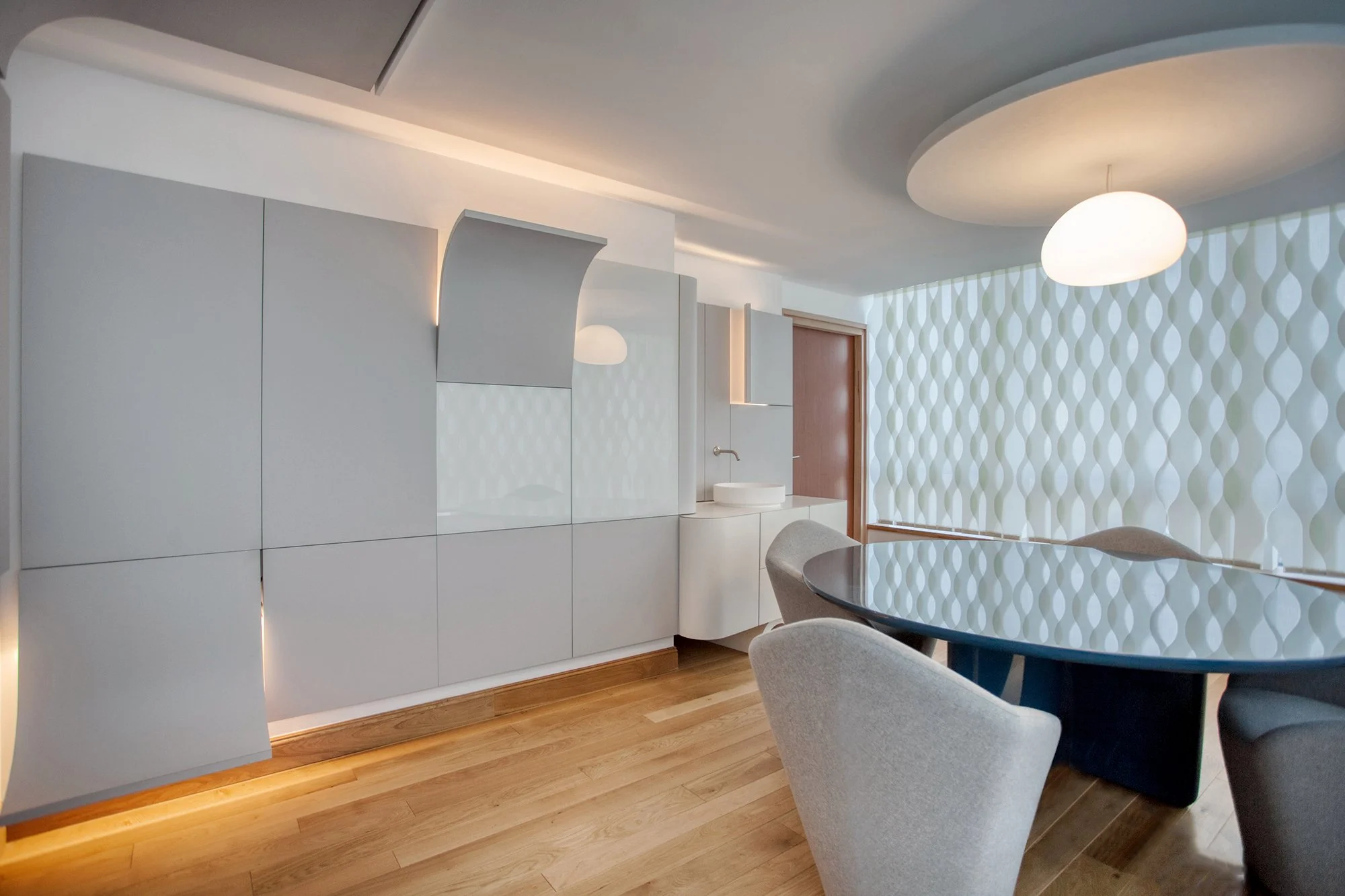 Chaque élément de cette salle, bien que fonctionnel, dépasse le cadre décoratif pour participer activement à l'éclairage et à l'acoustique de la pièce. Les formes arrondies des murs adoucissent l'ambiance, tandis que l'habillage technique dissimulé derrière des écrans tactiles et des panneaux coulissants permet de maintenir un fond esthétique épuré.